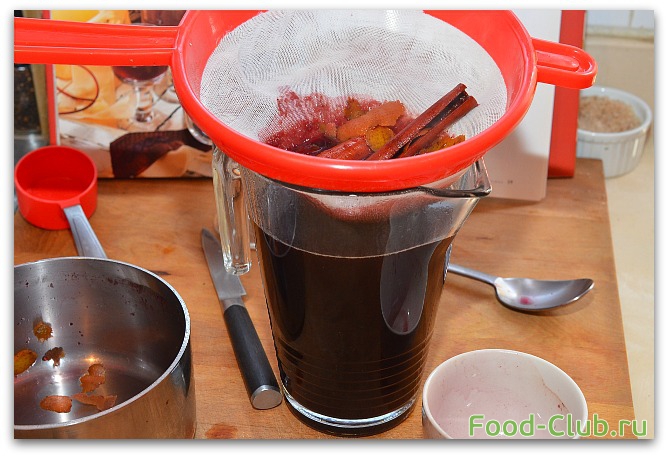 3. Процеживаем вино в кувшин и подаем к столу. Перед подачей можно снова немного подогреть глинтвейн, чтобы напиток был горячим.