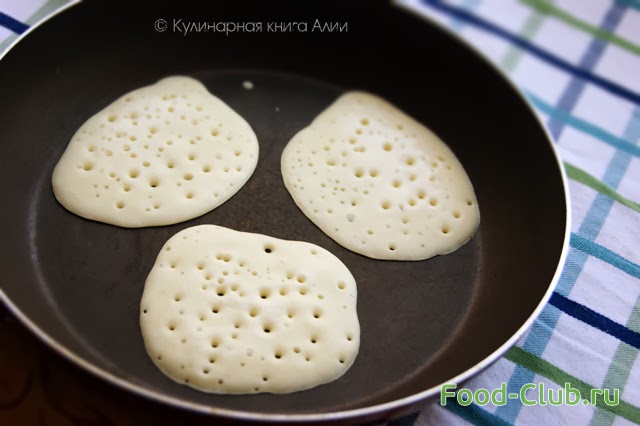 3. Теперь жарим сами блинчики. Тщательно прогрейте сковородку, ни чем ее не смазывайте (это важно). Теперь в центр сковородки налейте 2,5 ст. л. теста. Жарьте, пока на блинчике не появятся дырочки, а поверхность не будет сухой. Затем перекладывайте блинчик в тарелку. Готовьте, пока тесто не кончится. Заметьте, жарить надо только с одной стороны.