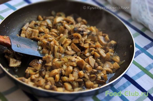 2. Тем временем готовим начинку. Разогрейте сковородку с маслом. Измельчите лук и слегка обжарьте его. Грибы нарежьте на мелкие кусочки и добавьте к луку. Посолите, поперчите и перемешайте. Жарьте все минут 15, пока полностью не испарится жидкость. Натрите сыр на мелкой терке.