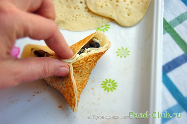 4. В центр каждого блинчика положите начинку, потом немного тертого сыра и сверните такие треугольнички. Сторона блина останется немного липкой и скрепить краешки не составит труда. Готовые блинчики выложите на противень, прогрейте духовку и подержите там блинчики, чтобы сыр расплавился.