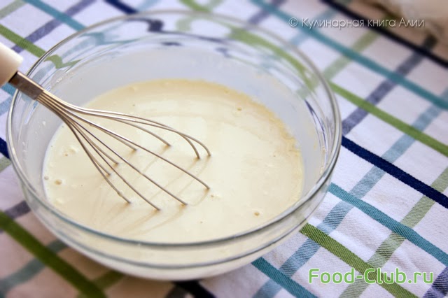 1. Сначала готовим тесто. В теплой воде растворите дрожжи и сахар, хорошенько перемешайте и оставьте минут на 10. Когда пройдет время, погрейте молоко и влейте его в дрожжи. Всыпьте просеянную муку и разрыхлитель, венчиком перемешайте все до однородности. Тесто получится жидким. Оставьте его минут на 20.
