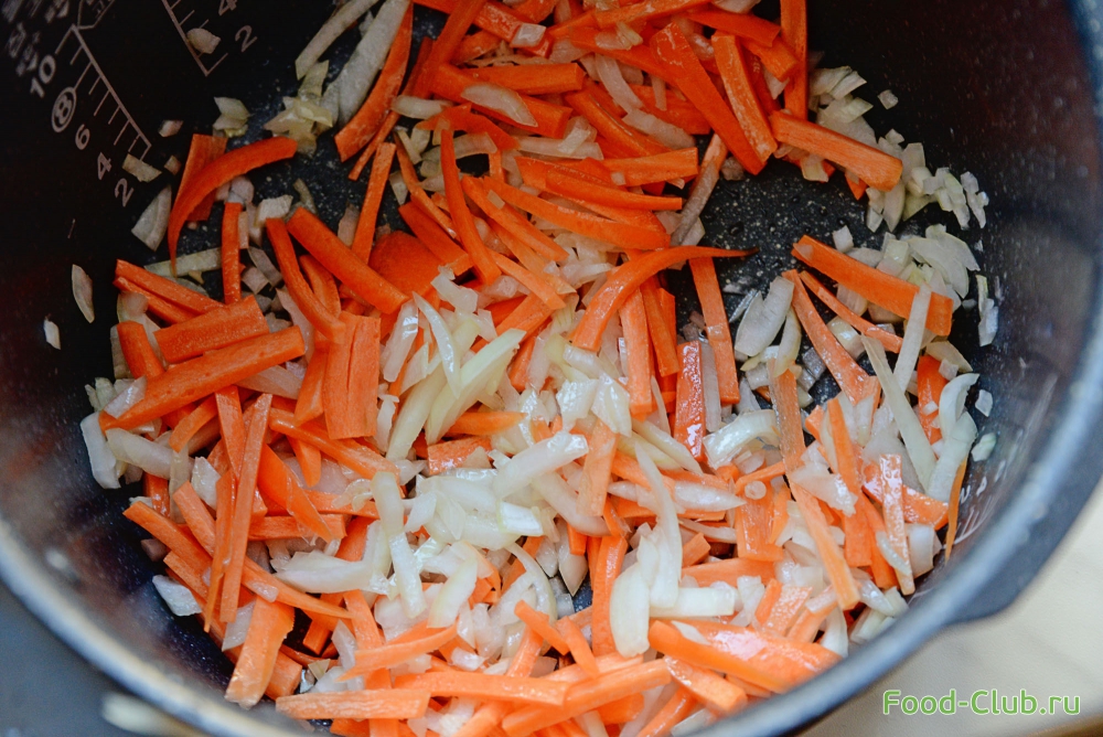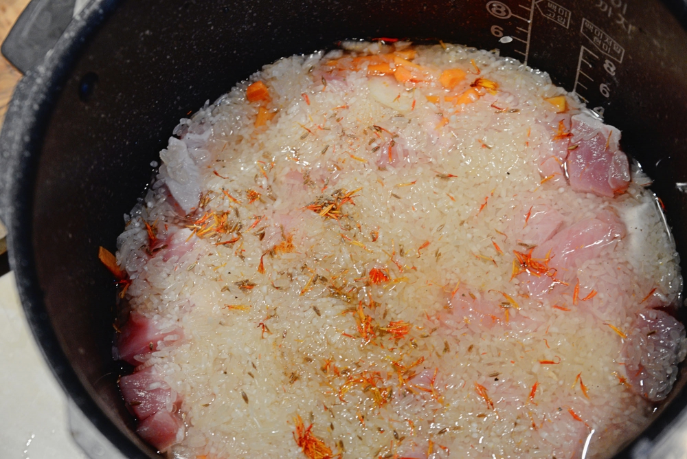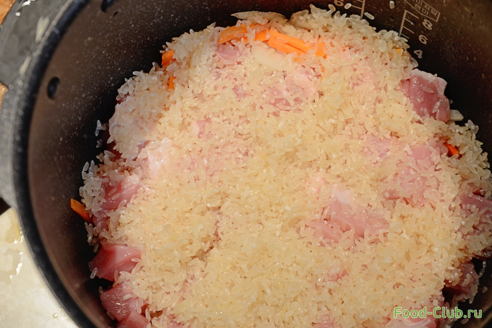 5. Сверху выложите рис и залейте водой. Включите режим «Готовка при низком давлении/Томление/Плов» (в зависимости от модели).