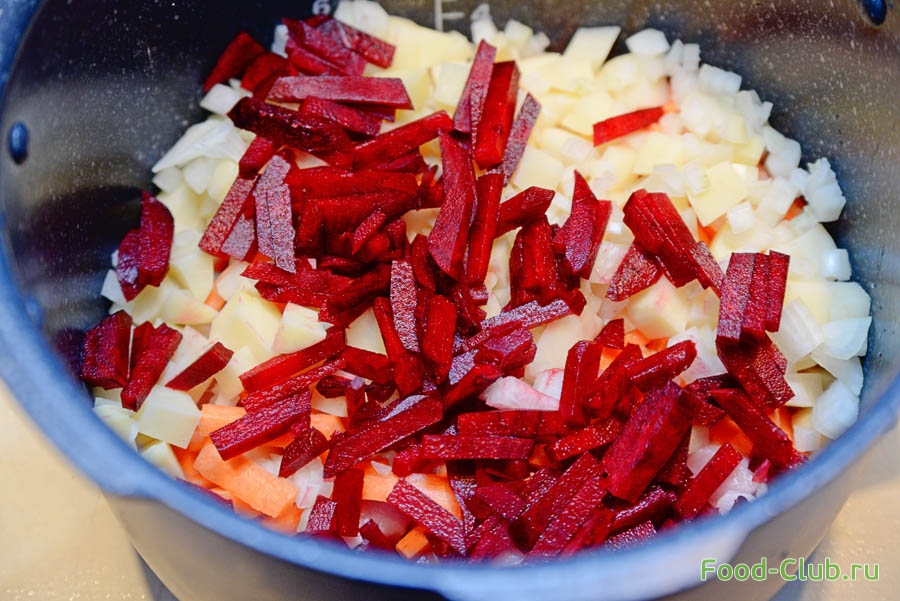 2. Лук мелко порежьте. Морковь и свеклу нарежьте соломкой. Выложите овощи на мясо. Посолите, поперчите, добавьте лавровый лист и поставьте на режим “Тушение” на 25-30 минут.