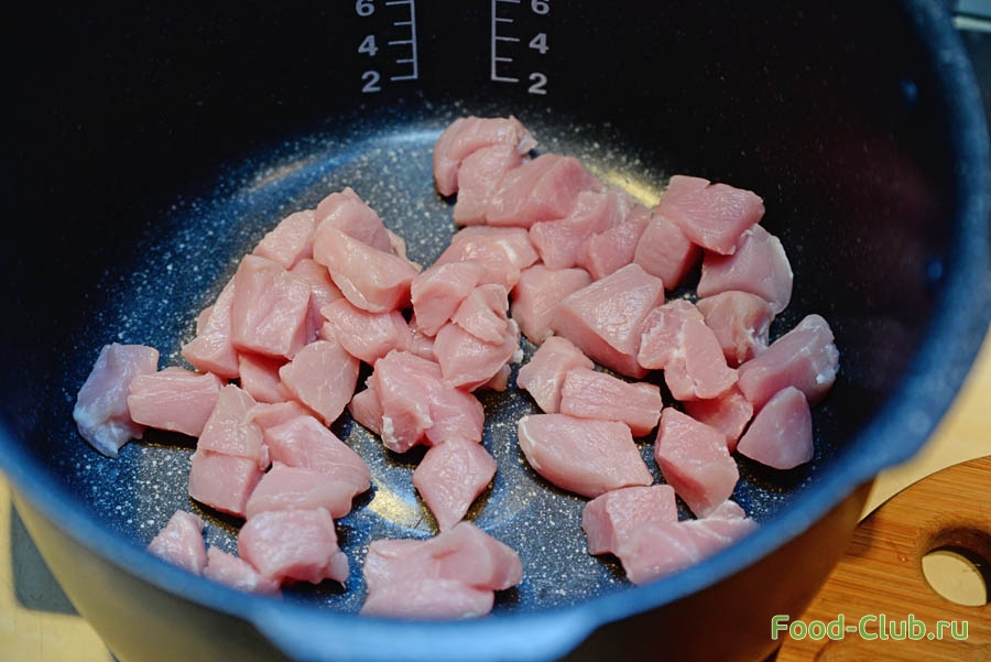 1. Мясо помойте, порежьте на небольшие кусочки. Выложите на дно мультиварки.