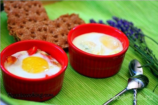 3. Формы с содержимым ставим в большую жаропрочную посуду, наполненную до половины водой. Ставим все это в разогретую духовку на 12-15 минут. Верх яиц за это время должен хорошо схватится. Подаем в горячем виде с кусочками подсушенного хлеба. Отличного вам завтрака, хорошего дня!