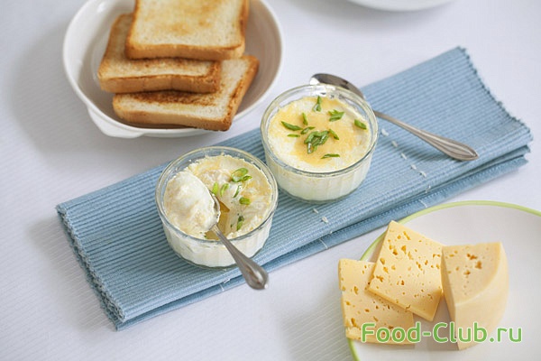 1. Формочки поставьте в глубокий противень с кипящей водой. Налейте в формочки половину сливок.2. Когда сливки нагреются, разбейте в формочки яйца. Налейте оставшиеся сливки и добавьте сливочное масло.