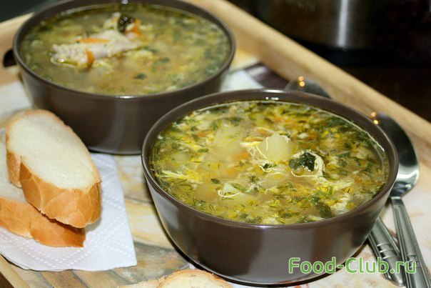 В тарелочке взбиваем яйца. Режем мелко зелень, добавляем ее в суп. Теперь тоненькой струйкой вливаем в суп взбитые яйца, даем постоять на огне еще минуту и выключаем.