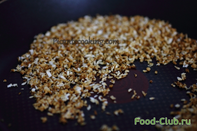 1. Разогрейте сухую сковородку и подрумяньте на ней кокосовую стружку. Снимите с огня. В небольшом сотейнике смешайте 2 вида молока. Поставьте сотейник на огонь.