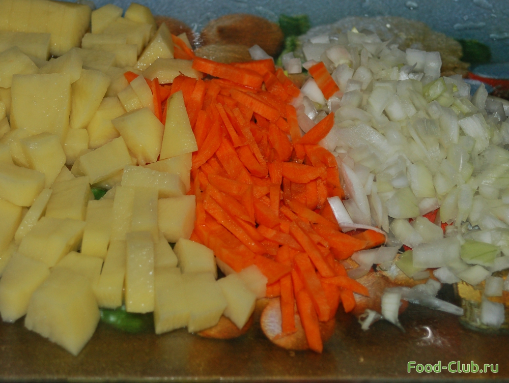 2. Когда пройдет время, измельчите лук. Морковку нарежьте морковку соломкой (если не хотите возиться, натрите на крупной терке), нарежьте картофель брусками. Добавьте овощи в кипящий суп, аккуратно перемешайте.