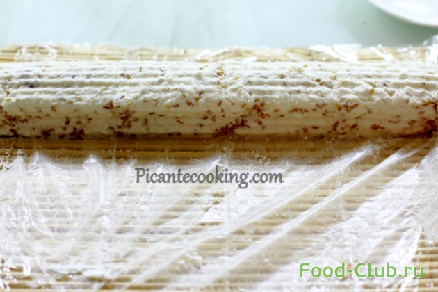 4. Сворачиваем творог плотным роллом. С помощью макисы это будет сделать достаточно легко. Творожный рулет отправляем в холодильник на 20 минут. Тем временем растапливаем шоколад на водяной бане.