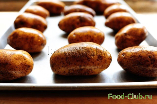 2. Выкладываем клубни на противень и ставим в предварительно разогретую духовку на 35-40 минут, пока картофель хорошо не пропечется.