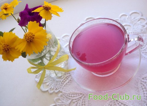 Разливаем чай по чашкам. В чашку кладём кружочек лимона, давим его ложкой и… наблюдаем чудо химической реакции! Вода из некрасивого серого цвета станет приятной розовой.
