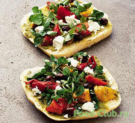 3. Полученные половинки лепешки намажьте слегка соусом песто. Сверху положите перец, немного салата и мягкий сыр. Положите сверху оливки и подавайте.