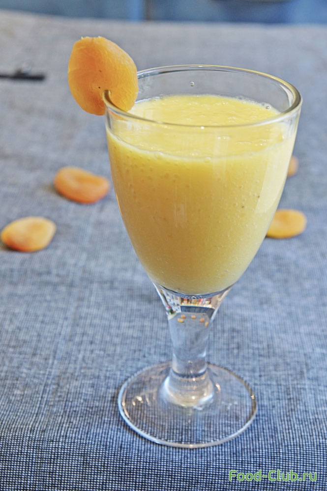 1. Курагу залейте апельсиновым соком и оставьте примерно на 30 минут.2. Все ингредиенты поместите в блендер и измельчите до однородной массы.
