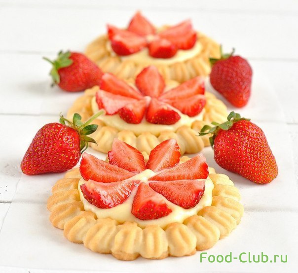 4. Готовый крем поместите в тарталетки и сверху положите кусочки клубники.