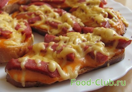 3. На кусочки батона выложите ветчину, сверху сырную смесь.