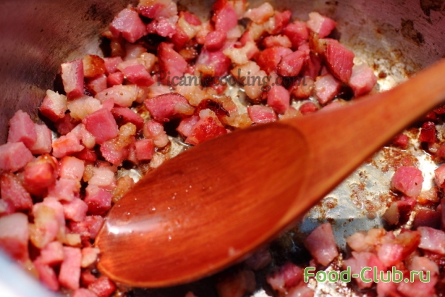 1. Для начала подготовим некоторые продукты: лук мелко порежьте, на мелкие кусочки нарежьте копченое мясо, очищенный картофель нарежьте брусочками. Залейте сухие грибы 300 мл кипящей воды и оставьте их минут на 20 настояться.