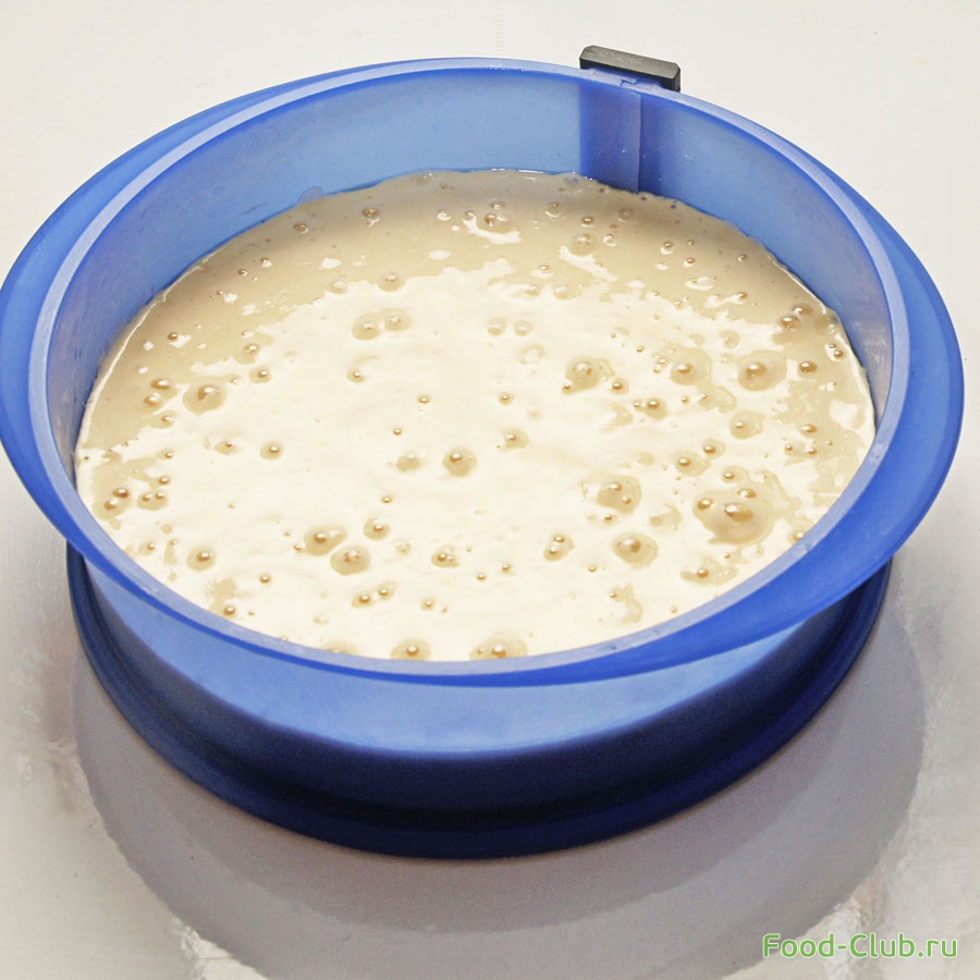 3. Тесто залейте в форму для торта, разровняйте верхушку и поставьте в духовку до готовности бисквита (около 20 минут).