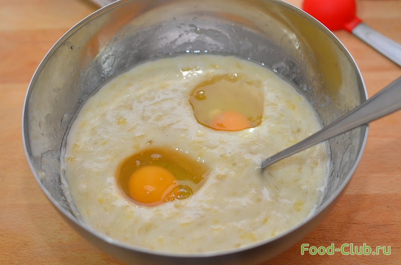2. Добавляем масло, хорошо перемешиваем, вбиваем яйца, вновь хорошо вымешиваем массу.