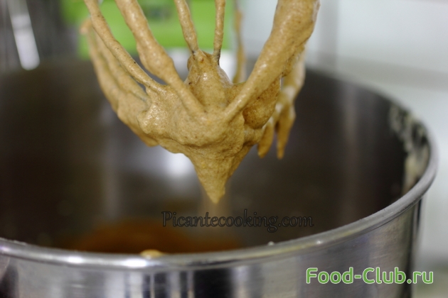 4. В отдельную посуду просеиваем муку и разрыхлитель, перемешиваем. Добавляем к сыпучим ингредиентам яблочный сок, перемешиваем, затем соединяем с приготовленной масляной массой и взбиваем до однородности.