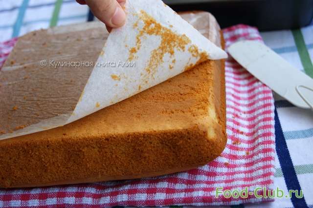 2. Когда бисквит будет готов, дайте ему немного остыть, а затем перевертите и снимите бумагу.