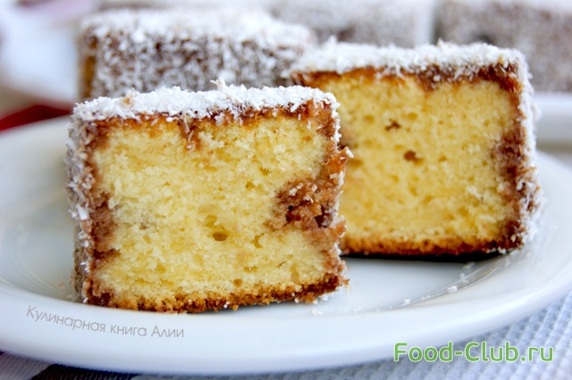 3. Разрежьте готовый бисквит на 16 кубиков. Тоненько срежьте краешки. С 4х сторон обмакните бисквит в соус (держите в соусе около 15 секунд или дольше). Дайте соусу немного стечь, а потом обмакните пирожные в кокосовую стружку. Такие пирожные можно кушать сразу после приготовления. Приятного аппетита!