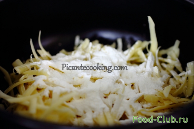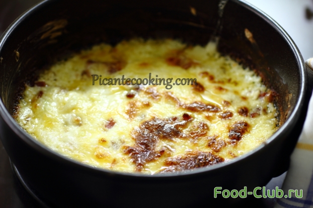 4. Перекладываем массу в небольшую жаропрочную посуду и ставим в предварительно разогретую духовку на 18 минут. Сыр должен расплавиться и хорошо подрумянится.