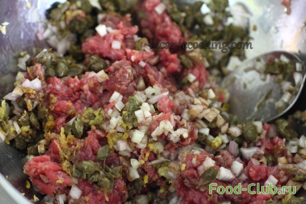 3. Перекладываем мясо в глубокую посуду, добавляем каперсы, измельченный лук и мелко порезанные анчоусы. Солим, перчим, приправляем уксусом и оливковым маслом. Все хорошо перемешиваем, накрываем пищевой пленкой и даем постоять в холодильнике 1 час.