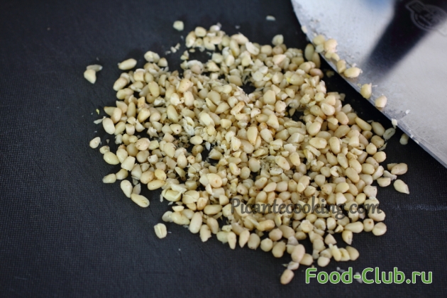 4. Кедровые орешки крупно измельчаем и подрумяниваем на сухой сковороде, снимаем с огня и даем полностью остыть.
