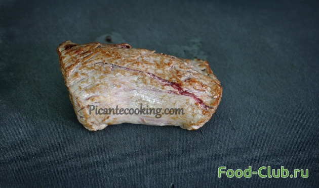 1. На сковороде на сильном огне разогреваем оливковое масло. Быстро обжариваем кусок говядины со всех сторон, так чтобы он лишь слегка подрумянился. Сразу же снимаем мясо с огня и перекладываем на разделочную доску.