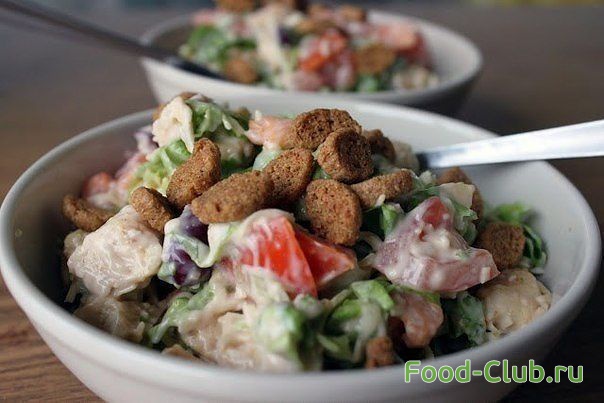 3. С фасоли сливаем жидкость, перемешиваем все ингредиенты и заправляем майонезом. Можно добавить любимые специи. Хорошенько все перемешиваем и при подаче украшаем сухариками.