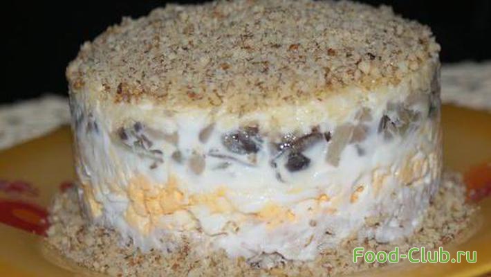 Сверху посыпьте рубленными грецкими орехами. Не забудьте солить и перчить по вкусу каждый слой.