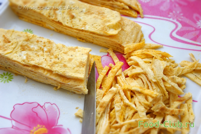 Готовые блинчики сложите вместе, разрежьте на 4 части и нарежьте соломкой. -