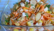 5. Выкладываем салат слоями (каждый слой заправляйте смесью сметаны и майонеза, солите и перчите при необходимости).