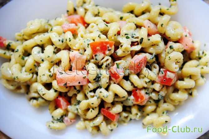 11. Помидоры порежьте небольшими кубиками и украсьте ими макароны.