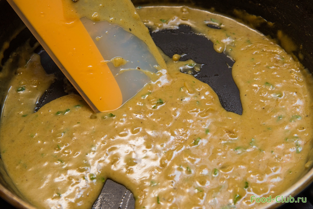 4. Снимите сковороду с плиты, залейте кипящий бульон или молоко, хорошо перемешайте. Верните на сковороду, доведите до кипения и готовьте на слабом огне около 12-15 минут. Периодически перемешивайте соус.