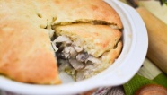 2. Тесто обомнем и поделим на два неравных кусочка. БОльшую часть теста раскатаем в круг и выложим в форму так, чтобы края свисали. Выложим начинку, разровняем. Остатки теста раскатаем, накроем пирог, края защипим, лишнее обрежем.