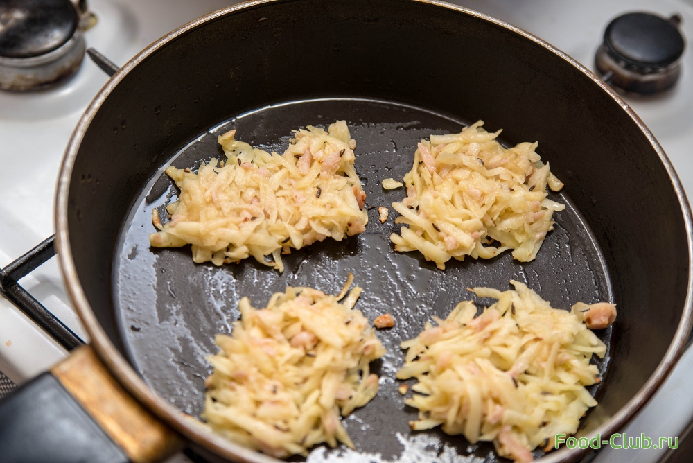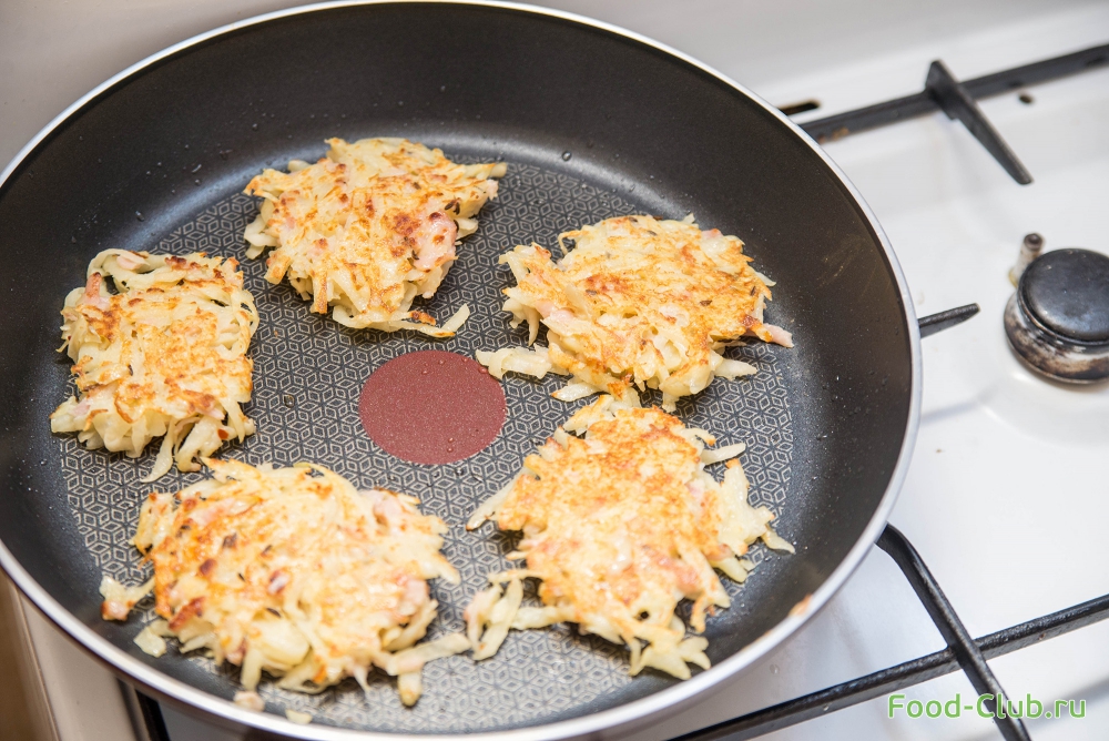 2. Нагрейте сковороду с растительным маслом и сформируйте на сковороде из полученного теста драники (на 1 шт около 1 ст.л. теста). Готовьте на среднем огне около 2-3 минут.