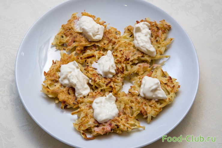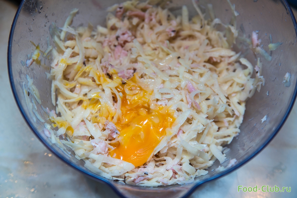 1. Натрите картофель на крупной терке и выжмите от лишней жидкости. Ветчину также натрите на терке.