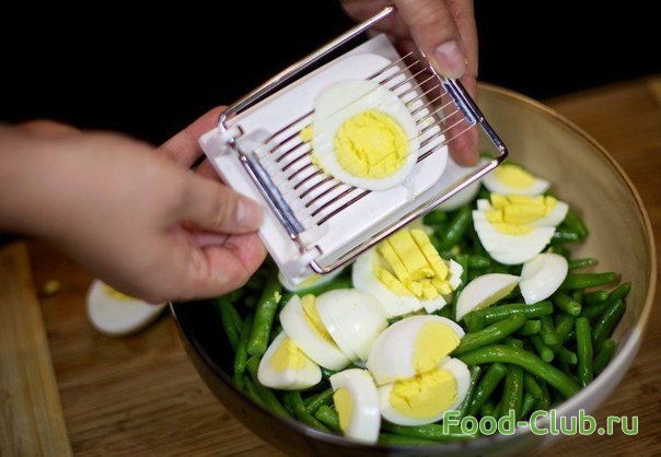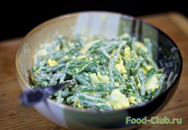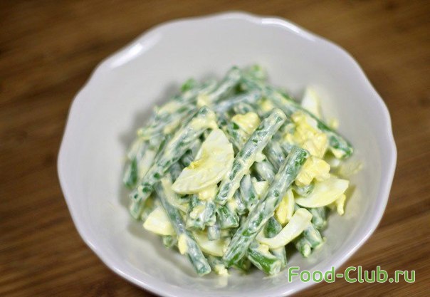 Готовую фасоль выложите в салатник, а сверху пропустите чеснок через пресс. Очистите яйца и нарежьте их, добавьте к фасоли с чесноком. Добавьте соль по вкусу (я еще добавляю черный молотый перец). Заправьте майонезом, перемешайте и подавайте к столу. Приятного аппетита!