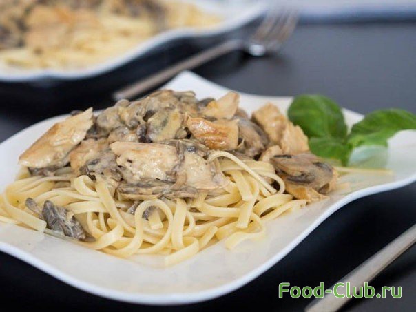 6. Отварите пасту. Выложите поверх пасты приготовленные грибы с курицей в соусе. Сразу же подавайте.