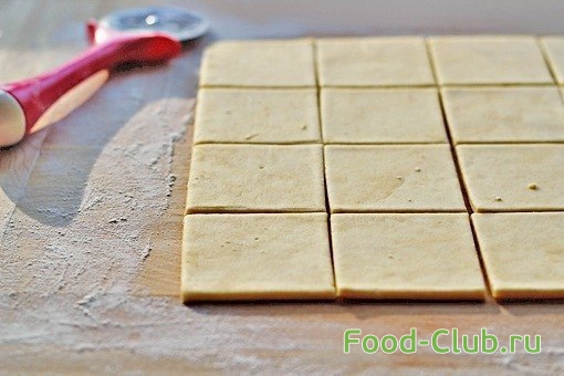 4. Раскатываем тесто в тонкий пласт в 3 мм и разделяем на квадратики примерно 6 на 6 см.