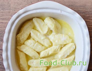 3. Добавляем к массе 150 грамм муки, вымешиваем тесто. На разделочную лоску высыпаем остатки муки, порциями выкладываем тесто и формируем продолговатую колбаску, не сильно обваливая ее в муке. Нарезаем творожистую колбаску поперек небольшими ломтиками в пол сантиметра.