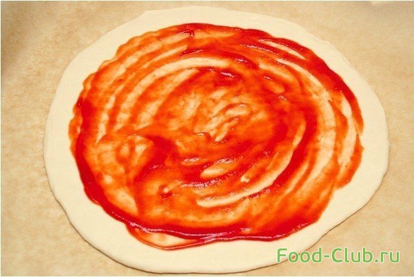 5. Поднявшееся тесто разминаем, скатываем в шар и раскатываем на, просыпанном мукой, рабочем месте в круг диаметром 30 см Толщина теста должна быть не более 5 мм. Сверху обмазываем томатным соусом.