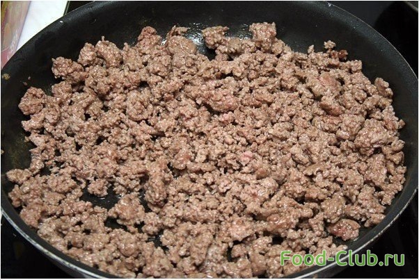 2. В сковороде, на оливковом масле, на среднем огне обжариваем фарш до готовности.