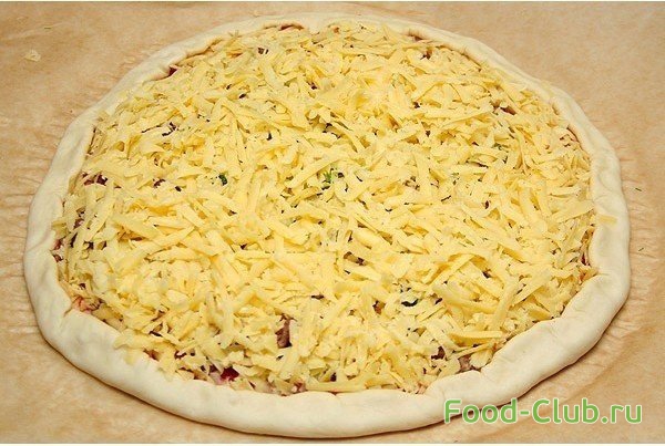7. Сверху щедро посыпаем тертым сыром, края пиццы можно немного завернуть.