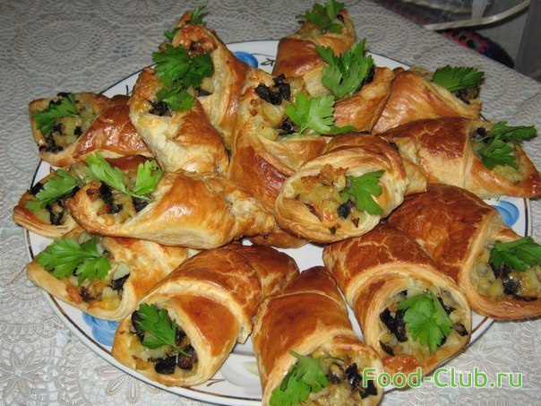 8. Внутреннюю часть каждого прямоугольника теста смажьте яйцом и выложите начинку из грибов и сыра. Аккуратно сверните тесто в кулечки.