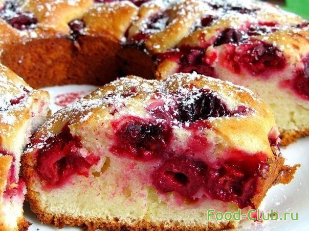 В подготовленную форму для выпечки вылейте тесто, затем выложите вишню и слегка притопите ее в тесте.Выпекайте минут 35-40, проверяйте готовность сухой зубочисткой.Готовый пирог подавайте, посыпав сахарной пудрой. Приятного вам чаепития!