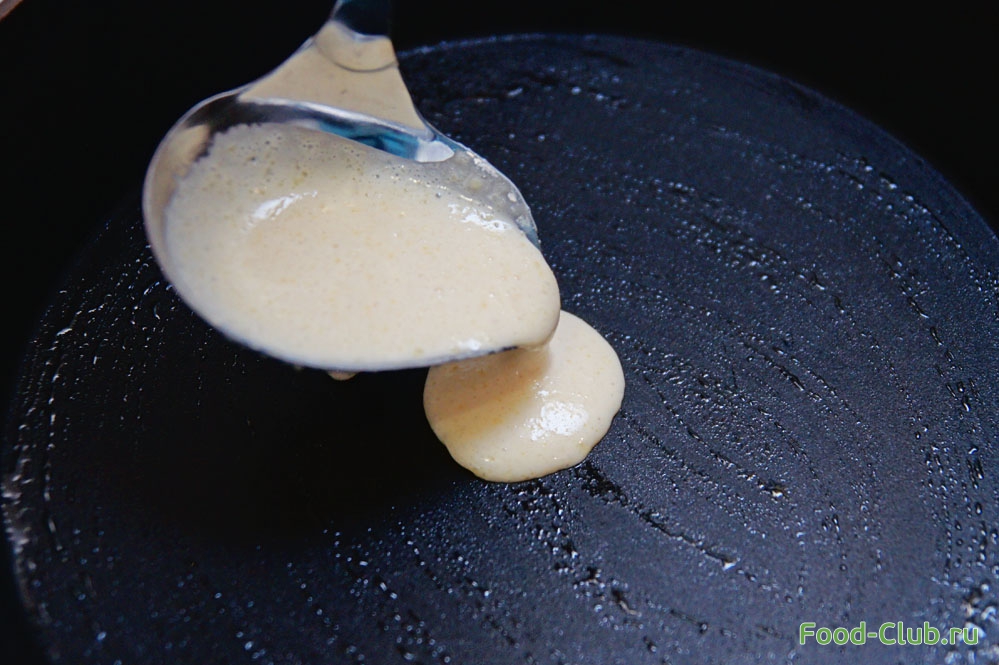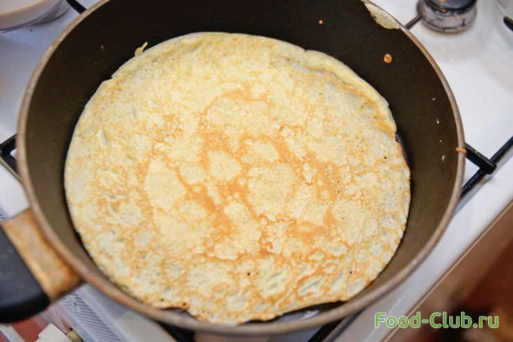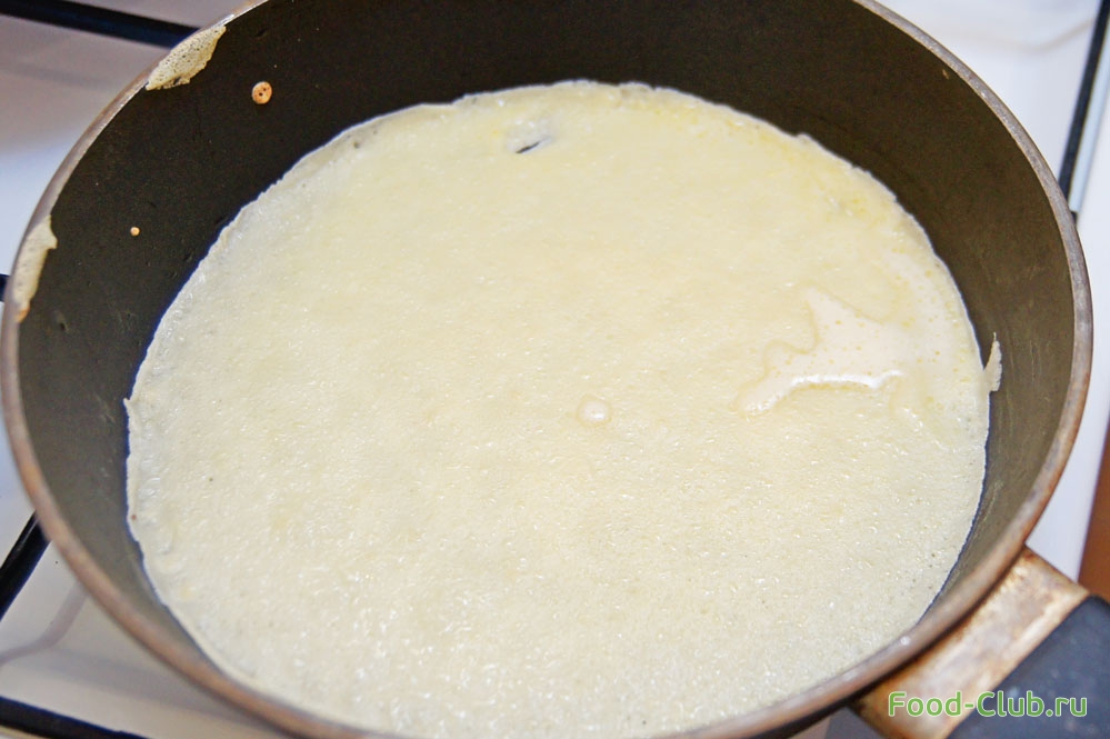 1. Приготовьте тесто по одному из рецептов (воспользуйтесь поиском или меню на нашем сайте). Разогрейте сковороду, смажьте маслом и вылейте примерно один половник теста. Быстро распределите его по сковороде. Если вдруг не хватило теста, чтобы распределить его по всему дну сковороды, просто добавьте еще.