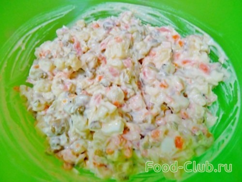 7. Все ингредиенты укладываем в салатник, заправляем майонезом и хорошо перемешиваем! Салат готов! Можно подавать к столу.